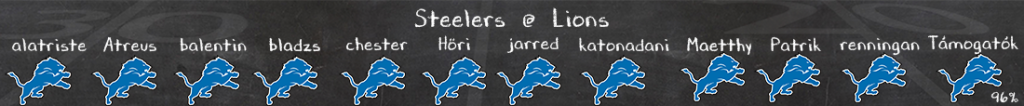 Nem teljesít rosszul a Steelers támadósor sem, Warren és Gainwell remek futójátéka mellé végre megjelent a legszebb napjait idéző Aaron Rodgers is, aki leginkább Metcalf segítségével emlékeztet mindenki, hogy jó az öreg a háznál; lelkes, kreatív, pontos, egy ideje jó nézni a játékát. Most is megmutathatja majd, mit tud, a Detroit secondary még mindig tele van sérültekkel, nagyjából bármelyik csapat tud ellenük passzolni, így Aarodnak sem lehet ez majd akadály. Nagyobb kérdés a futójáték, ezt ugyanis remekül hatástalanítja a Lions, mint ahogy TE-k ellen is jól fel tudnak lépni, és Hutchinsontól lehet azért félteni a támadófalat is. Ha Rodgers elszabadul, jó esély van rá, hogy elég pontot szereznek ez ellen a coverage ellen, anélkül viszont minden más fronton jobb csapatnak tűnik jelenleg ez a Detroit.