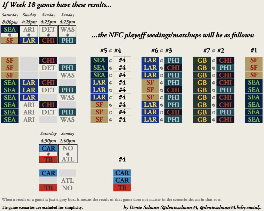 A Seahawks és a 49ers lemeccseli egymással az első kiemelést szombat este. Vereség esetén a Hawks fix 5. kiemelt, a 49ers pedig 5. vagy 6. kiemelt lehet a Rams mérkőzésének alakulásától függően.