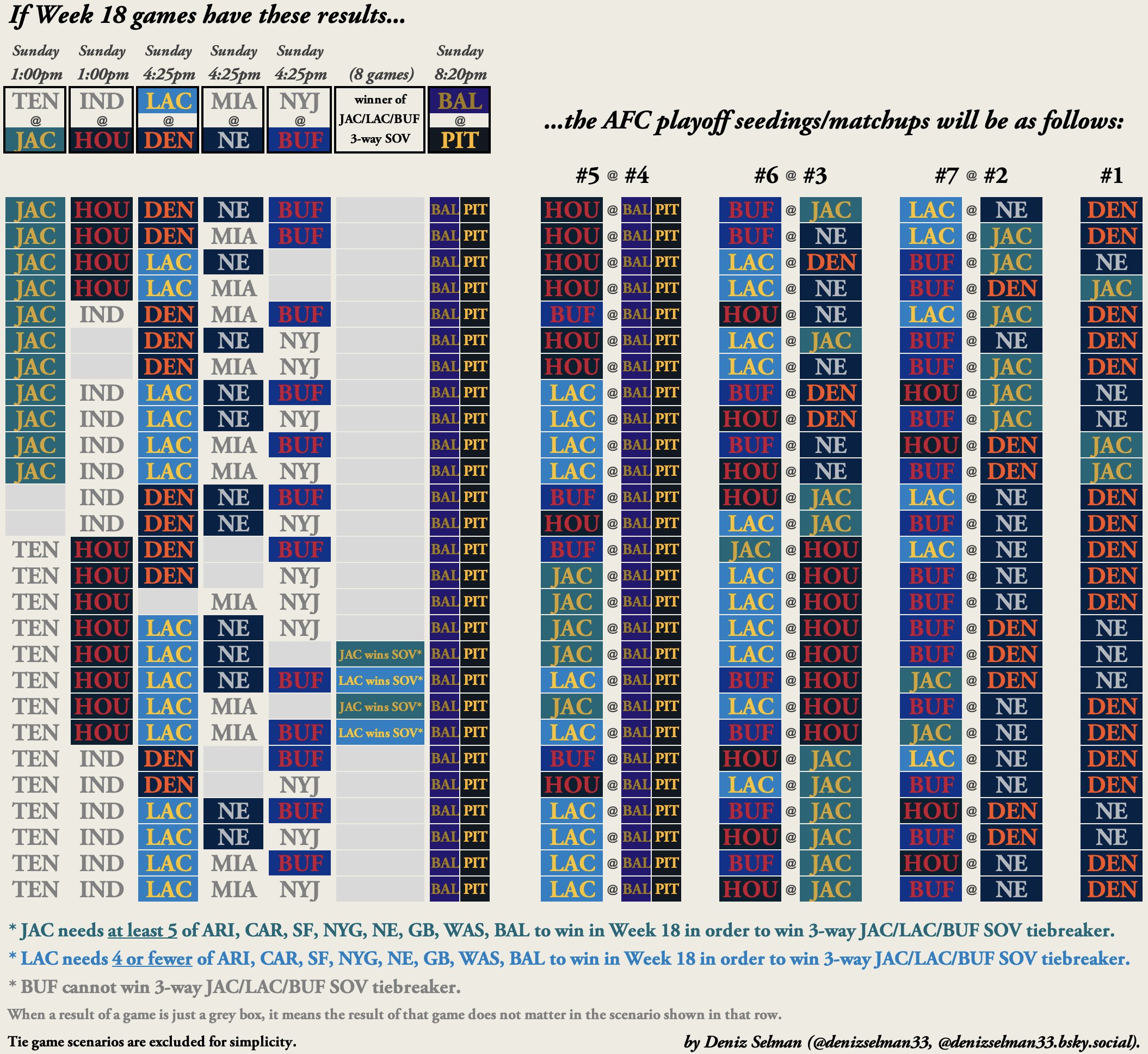 Broncos egy győzelemmel vagy a Patriots vereségével első kiemelt lesz, de akár még a 3. helyre is lecsúszhat, ha rosszul alakulnak a dolgok. Persze a pihentető Chargers ellen illene hozni a győzelmet. Herberték lehetnének 5-7. kiemelt között bárhol az eredmények függvényében, de nem elég fontos ez nekik, a várható vereségükkel pedig vagy jó eséllyel 7.-ek lesznek.