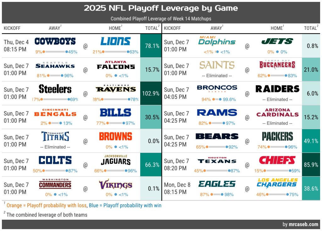 Jól látszik, hogy sok a nagyon fontos mérkőzés a fordulóban. A legfontosabb a Steelers és a Ravens csörtéje, ahol a győztes elég nagy lépéselőnybe kerül a vesztessel szemben. A Chiefs és a Texans vasárnap esti rangadója is óriásit téttel bír, hiszen mindkét gárdának 40+% valószínűség múlik ezen a mérkőzésen. A Jaguars-Colts, valamint a Packers-Bears csoportrangadók is hatalmas téttel bírnak a mai nap folyamán.
