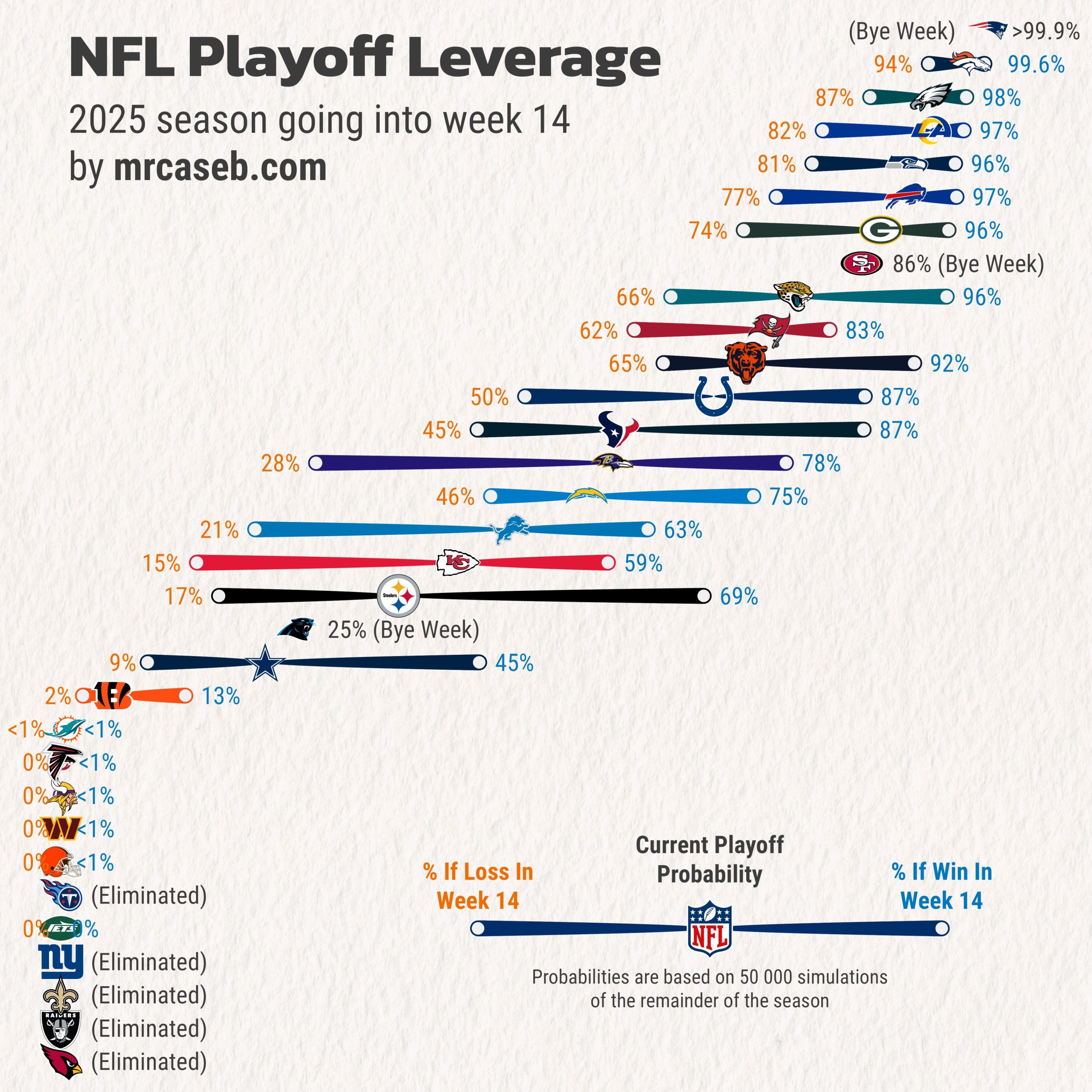 Jól látszik, hogy sok a nagyon fontos mérkőzés a fordulóban. A legfontosabb a Steelers és a Ravens csörtéje, ahol a győztes elég nagy lépéselőnybe kerül a vesztessel szemben. A Chiefs és a Texans vasárnap esti rangadója is óriásit téttel bír, hiszen mindkét gárdának 40+% valószínűség múlik ezen a mérkőzésen. A Jaguars-Colts, valamint a Packers-Bears csoportrangadók is hatalmas téttel bírnak a mai nap folyamán.