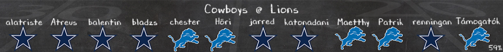 Hol lehet belekötni ebbe a Cowboys támadósorba? Prescott MVP szinten játszik, CeeDee Lamb kiváló, nála csak George Pickens jobb, aki elképesztő formában van. Javonte Williams újraélesztette a szezonját, remek munkát végez a földön, és mindehez ki kell emelni a támadófalat, ami relatíve gyengén kezdte a szezont, de azóta nagyon sokat fejlődött mind futás-, de főleg passzblokkolásban. Az egyetlen kérdőjel Tyler Guyton bal tackle, aki folyamatosan sérüléssel küzd; még vele is, de nélküle főleg elég sebezhető a fal azon oldala. Rajta kívül viszont mindenki egészséges, így várhatóan majd a Lions védelmet is komoly kihívás elé tudják állítani.