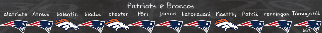 Úgyhogy tippem szerint a Denver pont ugyanazt fogja támadó oldalon játszani mint eddig, és ennek a várható értéke Stidhamel, a nem nagyon sikerestől a totális összeomlásig terjed, a New England D ellen. Az igaz, hogy 4 emberes passz siettetés eddig sem ment, és a Denver O fala jobb, mint az eddigi ellenfeleké. Ez az előny ott van, és aligha titok bárki számára. Ezért várhatóan megy majd a megtévesztés folyamatosan, mivel ez a helyzet, ezt kell megoldani. Várható érték, hogy lesz pát TO, és/vagy lesz nagyon sok elakadó drive. Itt az a remény a Denver számára, hogy elrontják párszor a védekezést hátul és üresben lesz egy-egy hosszú célpont. A Broncos számára ekkor lehetőség nyílhat hosszú haladásra. Ebből lehet pár TD. De a 3-hoz már nagyon együtt kell állnia a csillagoknak.