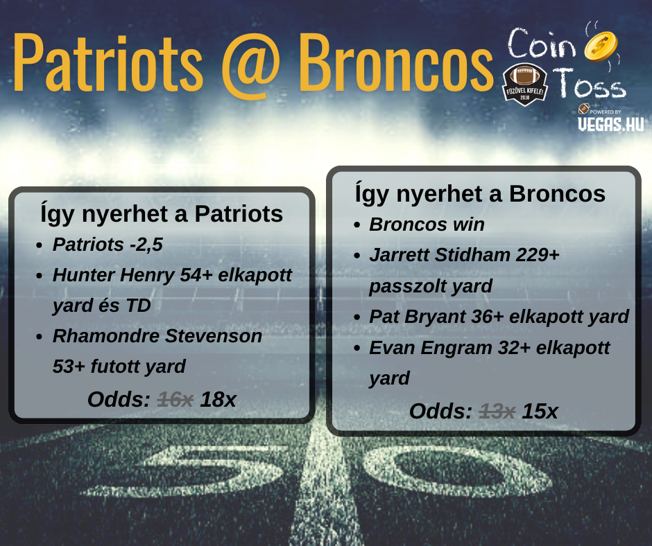 A Broncos kicsit megfogyatkozott elkapókból, Bryant és Franklin is sérüléssel küzd, Suttont pedig le fogja venni Gonzalez a pályáról. Evan Engram eredetileg egy “jokernek” érkezett a csapathoz, de Bo Nix elég keveset nézett felé, mert nem szeret középre passzolni. A Patriots elég jó WR-ek ellen, de futók és tight endek ellen nem a passzjátékban. Ha ezeket így mind összeadjuk, azaz nagyobb szerep, új irányító, plusz a matchup, akkor kinézhetünk egy nagyobb meccset Engramből. És a 40 yard nem is túl sok, TD-ből pedig kijár már neki egy, hiszen csak egy volt neki egész évben, még a 4. fordulóban. Nagy pénzt nem tennék azért Engramre, mert ez egy “mi van ha” fogadás, de 20-as oddsért nagyon tetszik kis téttel.