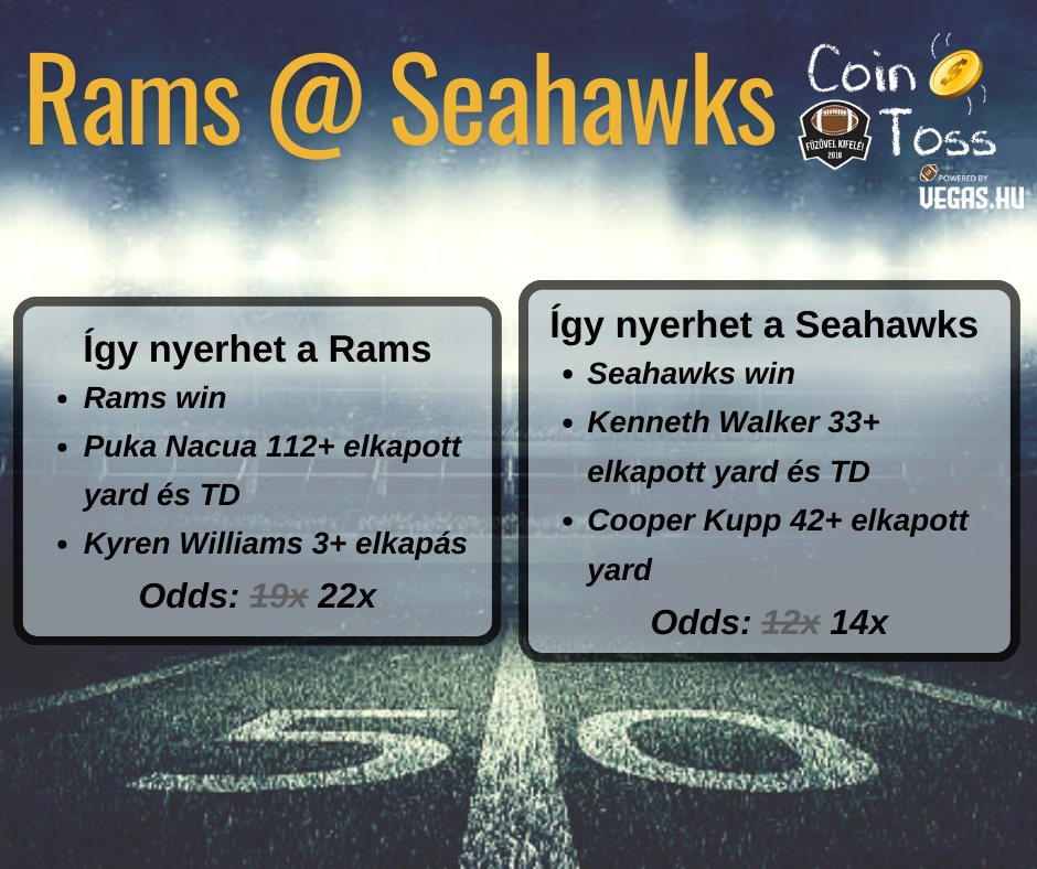 A Seahawks defense elit futás ellen és elit szélső elkapók ellen. Azonban van egy dolog, amiben a liga legrosszabbjai voltak idén. Futó elkapásokban. Átlag 5,83-at engedtek, ami a legtöbb a ligában. Persze ez épp azért van mert mindent elvesznek és sokszor csak a checkdown marad, de ez itt fogadás szempontból mindegy is. Szóval a Seahawks sok RB elkapást enged, Kyren Williamsnek pedig az utóbbi 5 meccséből 4-szer is megvolt ez a szám. A yardok is működhetnek, de szerintem jó esély van arra, hogy két elkapás nem elég a 14 yardhoz, mert a Hawks gyorsan odaér és szerel. Szóval ha a yardok jönnek, szerintem az elkapások is, amire meg jobb oddsot kapunk.