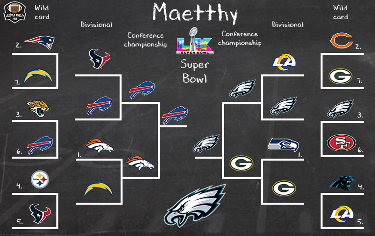 Konf. döntők és Super Bowl: A Packers tovább ápolja a hagyományt, miszerint NFC döntőben összeomlanak. Az Eagles szétfutja őket, ahogy tavaly a Commanders ellen tették. Még csak szoros sem lesz a meccs. Ellentétben az AFC döntővel, ahol ismét egy 60+ yardos mezőnygól fog dönteni. Ami kimarad a Jaguars részéről, így a Broncos jut a döntőbe. A Super Bowlon aztán megismétlődik ugyanaz, ami tavaly. Csak most az Eagles fogja átélni azt a rémálmot, amit legutóbb a Chiefs. Harmadik negyed elején már akkora különbség lesz, hogy már garbage time-ot fogjuk nézni, és nagyon simán nyer a Broncos megakadályozva ezzel a címvédést.