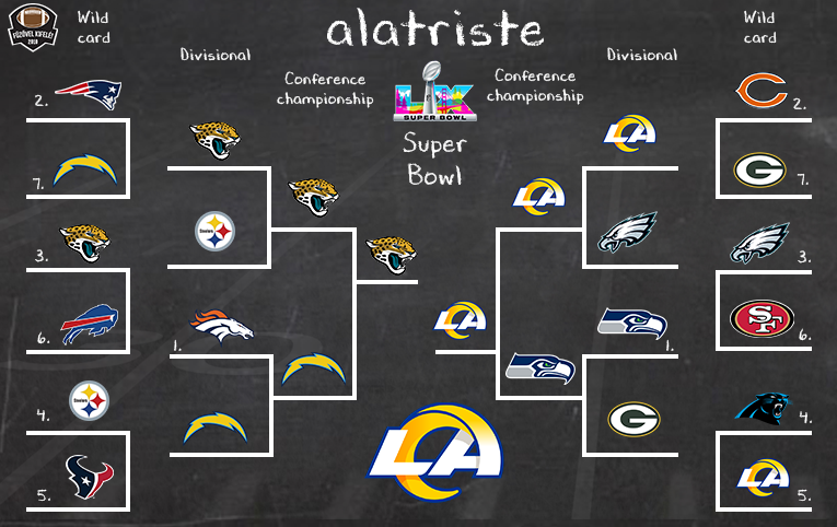 A túloldalt egyszerűbb a helyzet. A Bears mérlege és a mutatott játéka nincs összhangban, ezt pedig egy közepes Packers is kihasználja. A meccsen 350+ futott yard lesz. Az Eagles rostere sajnos jobb, de főleg egészségesebb a 49ersnél. A Rams pedig legalább 20-at ír a visszavágón a Panthersre. A Packers maga se tudja, hogy kerül a Hawks halálosztó védelme elé, de nem is lesz sok idejük gondolkozni. Love-ék 10 szerzett pont alatt maradnak és simán kiesnek. A Rams rosterét übereli az Eaglesé, de edző stábban és irányítóban is LA-ben a jobb egység. Ez elég lesz. A Seahawks ellen is kijön, hogy Darnold egy korrekt irányító, míg Stafford MVP. A Super Bowlban pedig hiába lesz sexy új csapatot látni, a Jaguars csak keresni fogja a játékát, a Rams pedig ismeri a terepet. Stafford megszerzi a másodikat is karrierjében és ellovagol a naplementébe.