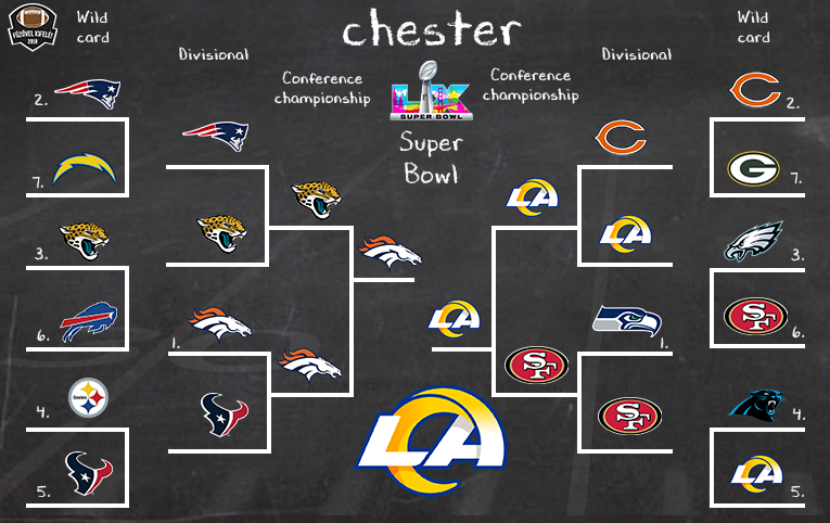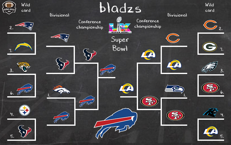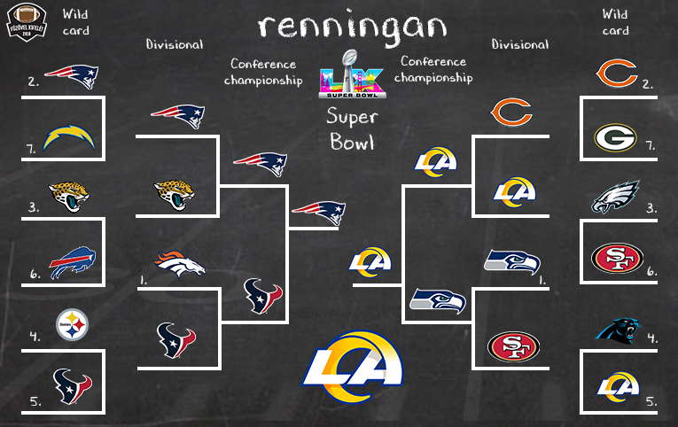 NFC: A Rams minden alapszakaszbeli frusztráltságát leveri a Panthersen, ez az egy biztos. A másik két találkozó már nem annyira. Az Eagles offense borzalmas, a védelem elit, a 49ersnek pedig nincs védelme, de a támadósor félelmetes – tiszta sor. Én a 49ersnek fogok szurkolni vagyis tuti győz az Eagles, és meg is adom nekik a továbbjutást. A Bears és a Packers csörtéjéből pedig mindkettő nem eshet ki, így megyek a szimpatikusabb csapattal, vagyis a Chicagóval. A Seahawks így megkapja a 49erst, a Rams pedig mehet a Bearshez – egyértelmű mindkét kimenetel, így pedig a liga két legjobb csapata küzd meg a Super Bowlba jutásért, a Rams pedig behúzza a csoportrivális ellen.