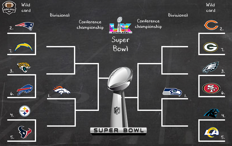 NFC: A Rams minden alapszakaszbeli frusztráltságát leveri a Panthersen, ez az egy biztos. A másik két találkozó már nem annyira. Az Eagles offense borzalmas, a védelem elit, a 49ersnek pedig nincs védelme, de a támadósor félelmetes – tiszta sor. Én a 49ersnek fogok szurkolni vagyis tuti győz az Eagles, és meg is adom nekik a továbbjutást. A Bears és a Packers csörtéjéből pedig mindkettő nem eshet ki, így megyek a szimpatikusabb csapattal, vagyis a Chicagóval. A Seahawks így megkapja a 49erst, a Rams pedig mehet a Bearshez – egyértelmű mindkét kimenetel, így pedig a liga két legjobb csapata küzd meg a Super Bowlba jutásért, a Rams pedig behúzza a csoportrivális ellen.