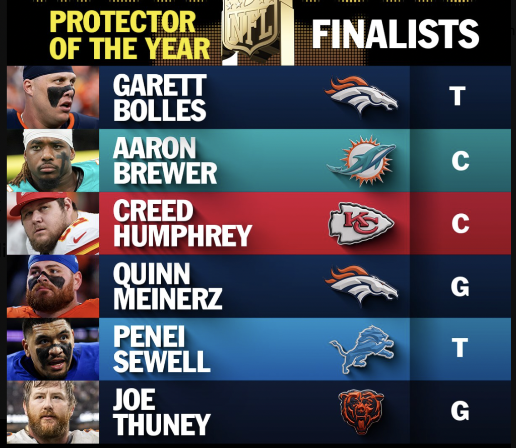 Tackle-ből, guardból és centerből is 2-2 került be a döntőbe. A két tackle Garrett Bolles (Broncos) és Penei Sewell (Lions), a két guard Joe Thuney (Bears) és Quinn Meinerz (Broncos), a két center pedig Aaron Brewer (Dolphins) és Creed Humphrey (Chiefs). Ahogy látható, két Broncos falember is ott van a legjobbak közt.