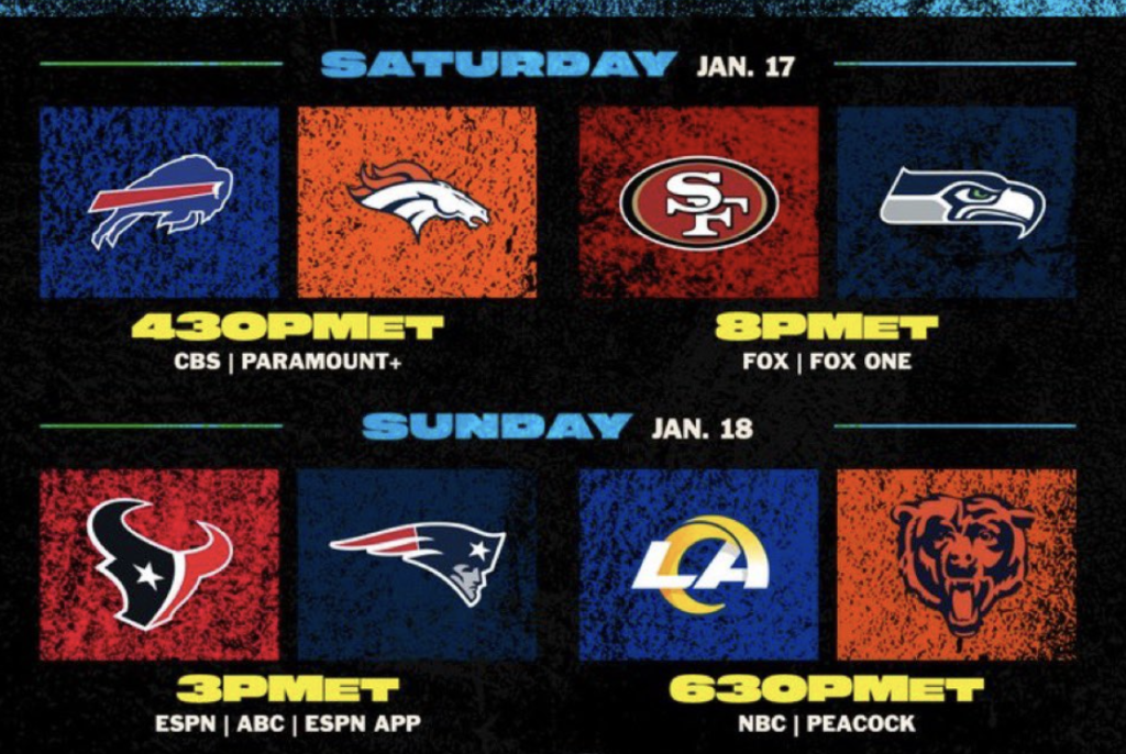 Az NFL-nek sikerült megszülnie, melyik mérkőzés mikor legyen a divisional körben. A Texans győzelme után kiadták a hétvége pontos menetrendjét, ami így néz ki: