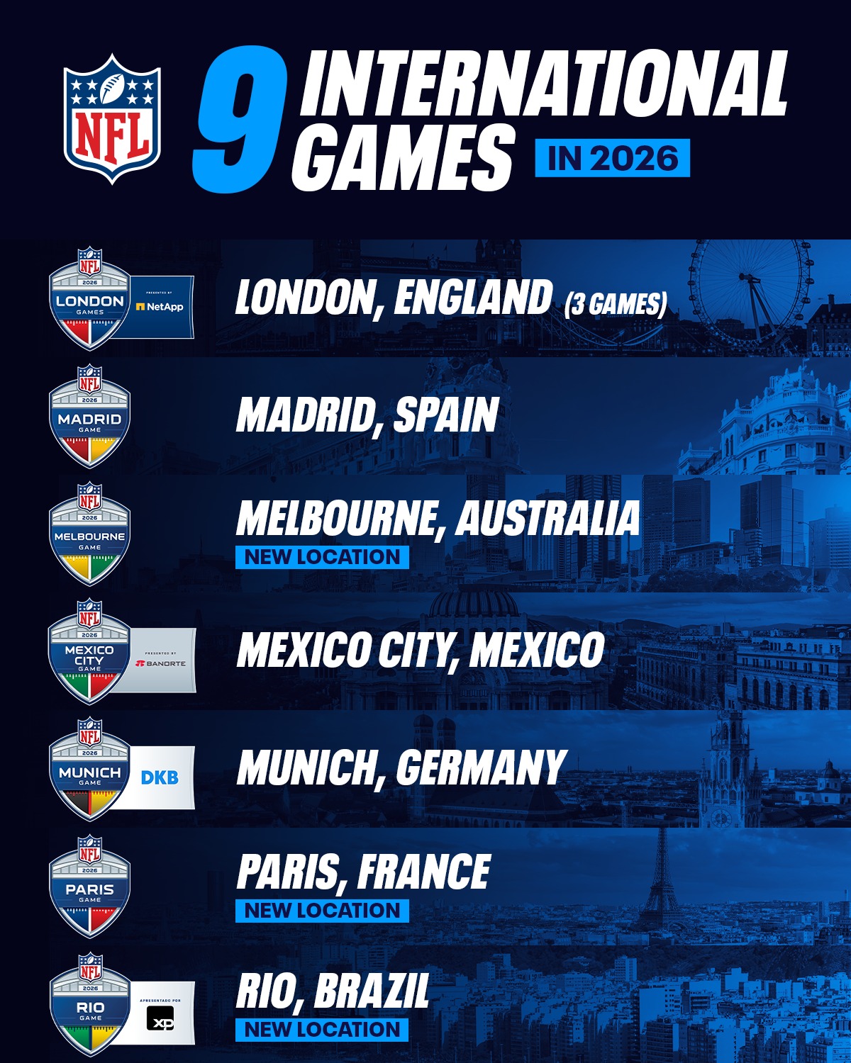 Roger Goodell ráerősített arra is, hogy a terv évi 16 nemzetközi mérkőzés rendezése, hogy minden egyes csapat játsszon egyet külföldön. Emellett az is kiderült, hogy Madriddal és a Bernabéu Stadiummal többéves szerződést kötöttek (idén várhatóan a Bears vagy a Chiefs játszhat majd Spanyolországban a marketing jogok alapján), illetve Mexikóvárossal is legalább három évre terveznek. Idén ugyan nem lesz NFL-meccs Dublinban, Írországban, de Goodell elmondása szerint vissza fog oda térni az NFL.