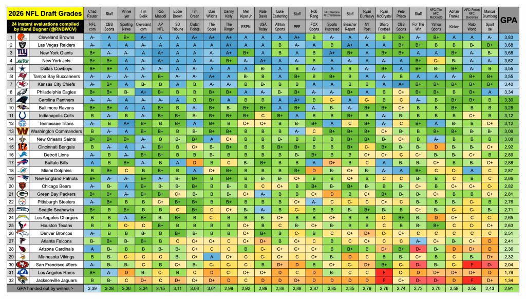 A holnapi nappal mi is belefogunk a részletes csapatonkénti draftértékelőkbe, de addig is megnézhetitek, hogy az amerikai szakértők mit gondoltak a csapatok draftjairól. Minden évben René Bugner állítja össze a táblázatot, ami a különböző szakértők osztályzatait tartalmazza csapatonként. Íme az idei kiadás (kattintásra nagyítható).